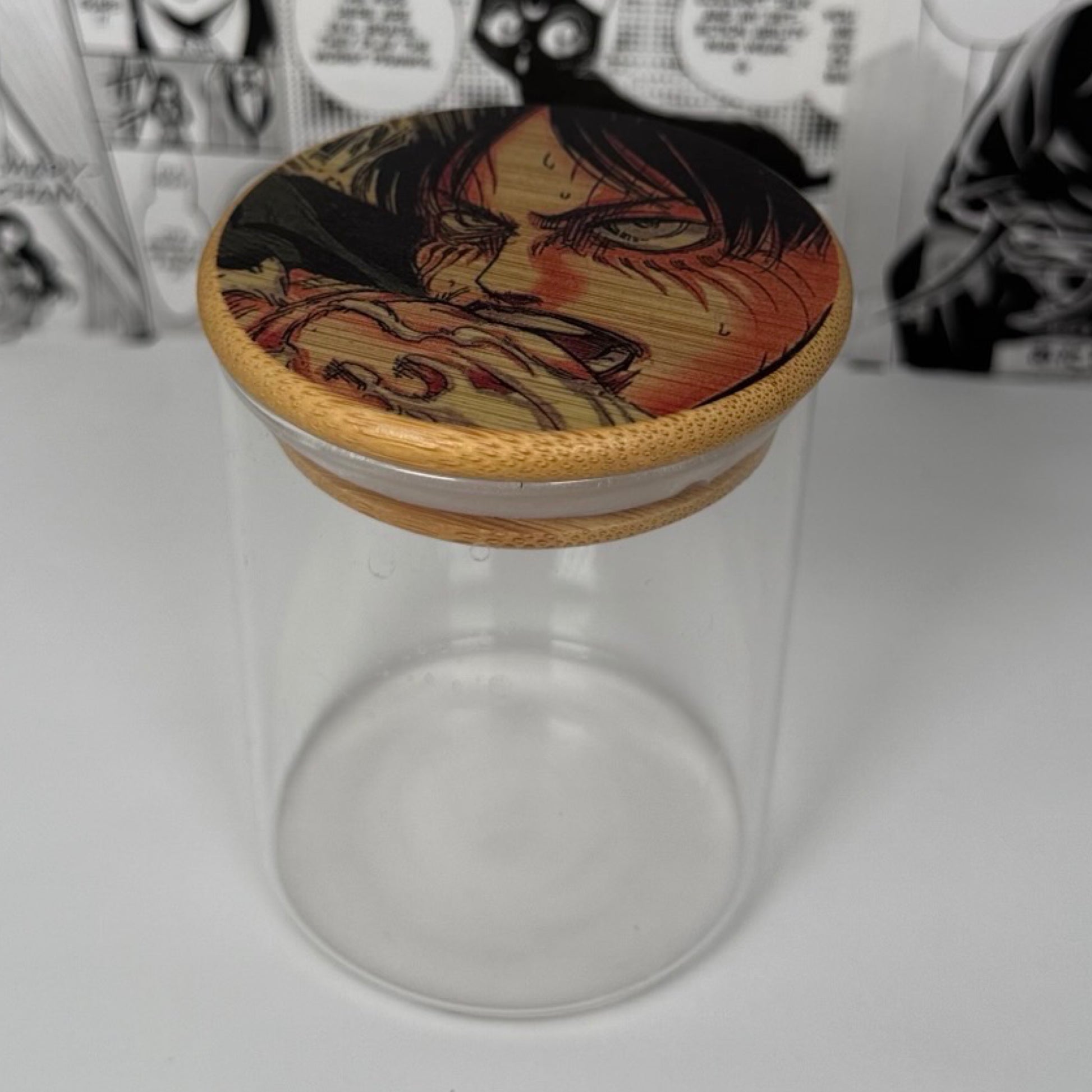 Perfect for anime fans and smokers, these glass stash jars combine function and fandom in one sleek design. Each jar features custom anime artwork printed on the glass and a matching design on the bamboo lid—making it a stylish way to store your herbs or spices while keeping them fresh and secure.