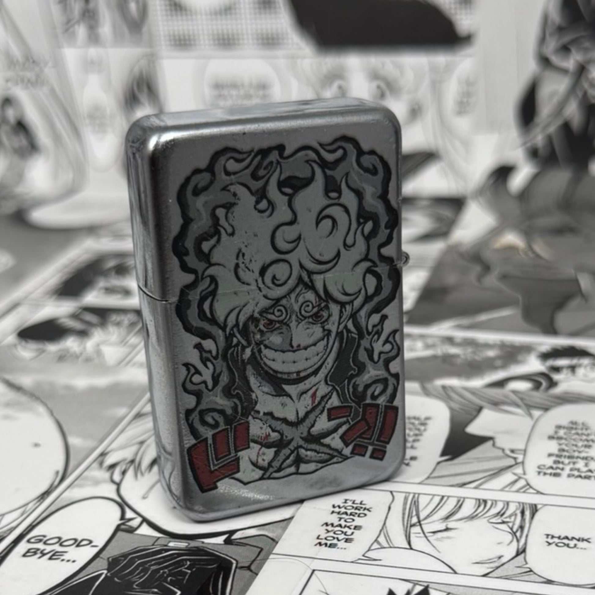 Lighter: High-quality flip lighter with anime designs printed on both sides. Available in matte white or chrome silver finishes.