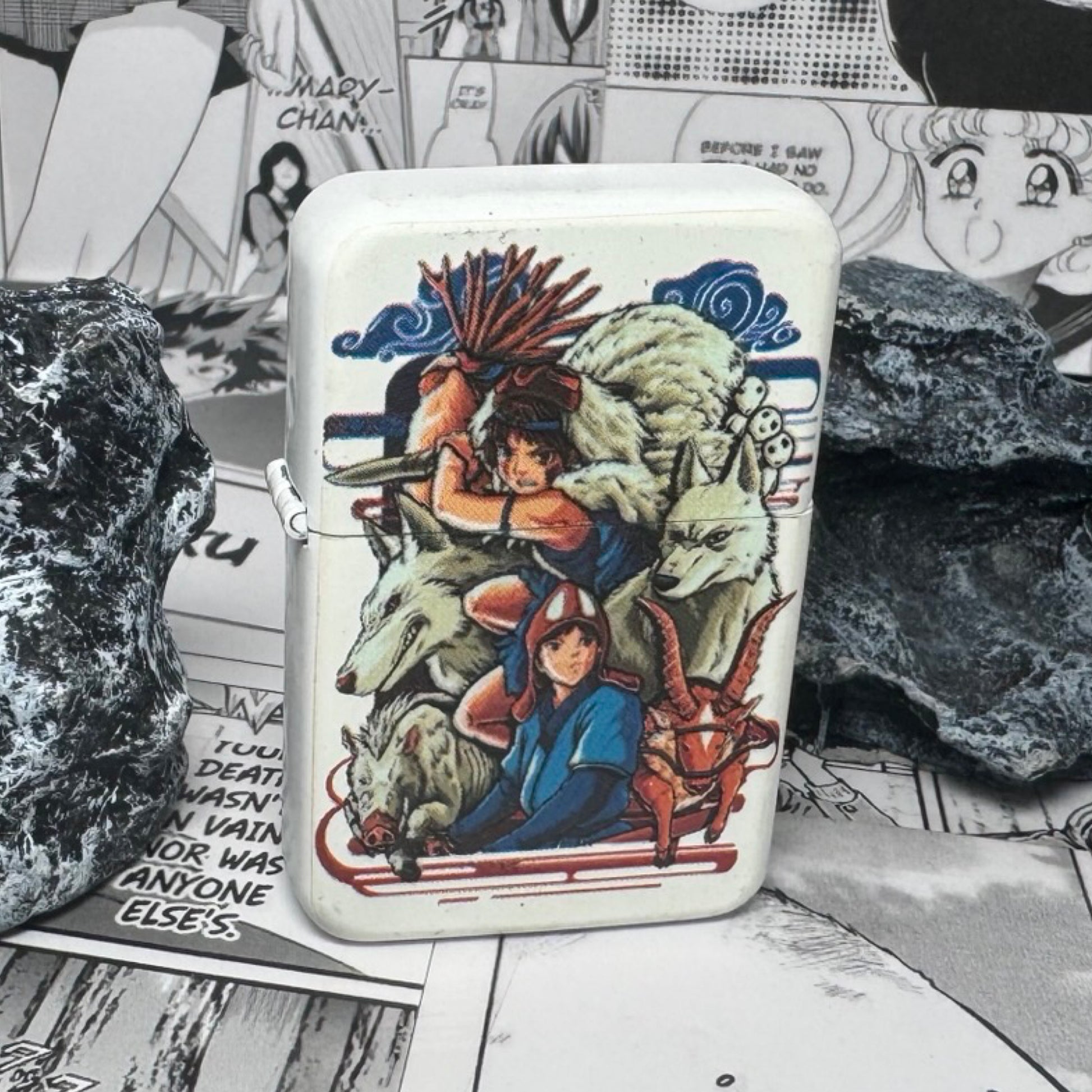 Lighter: High-quality flip lighter with anime designs printed on both sides. Available in matte white or chrome silver finishes.